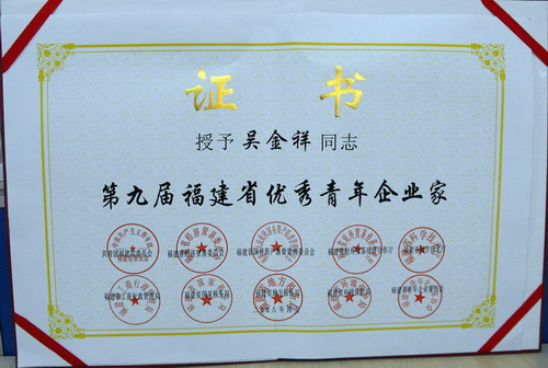 [喜訊] 日前,由共青團福建省委員會、福建省經(jīng)濟貿(mào)易委員會、福建省國有資產(chǎn)監(jiān)督管理委員會、福建省對外貿(mào)易經(jīng)濟合作廳、福建省科學(xué)技術(shù)廳、福建省工商行政管理局、福建省國家稅務(wù)局、福建省地方稅務(wù)局、福建省環(huán)境保護局、福建省青年企業(yè)家協(xié)會共同主辦的“第九屆福建省優(yōu)秀青年企業(yè)家”評選活動揭曉,鷺燕集團董事長兼總裁---吳金祥先生榮獲“福建省優(yōu)秀青年企業(yè)家”榮譽稱號!