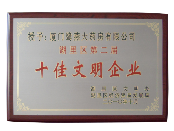 廈門鷺燕大藥房有限公司于2010年10月被廈門市湖里區(qū)文明辦、廈門市湖里區(qū)經(jīng)濟貿(mào)易發(fā)展局評為湖里區(qū)第二屆“十佳文明企業(yè)“榮譽稱號。